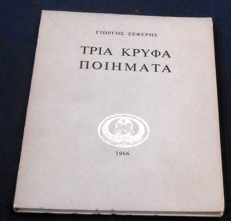 Athènes, Institut Français, 1966, édition originale numérotée. Broché, 14 cm x 19 cm, 67 pages. Poèmes en grec de Yorgos (Georges) Séféris, envoi de l’auteur à Kostas Papaioannou. Très bon état. Dernier ouvrage paru du vivant de l’auteur