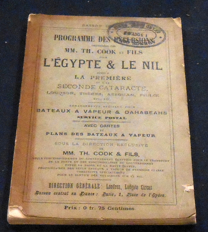 Paris, Cook & Fils, 1892. Broché, 13,5 cm x 21,5 cm, 95 pages, 1 carte dépliante hors-texte des voyages de l’agence en Méditerranée et au Moyen-Orient, 15 cartes hors-texte et plans , photos hors-texte. Dates des départs, itinéraires, tarifs, services postaux, flottille, règlement, distances, liste des personnes de distinction qui ont voyagé avec l’agence, … Dos à restaurer sinon bon état
