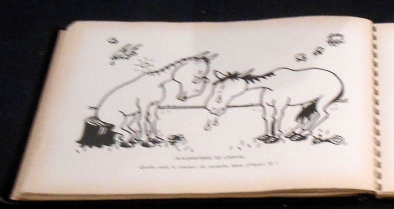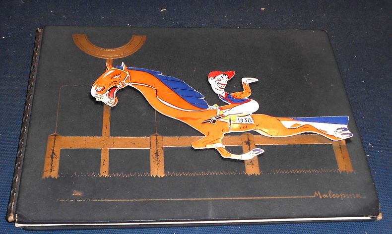 Paris, Paris-Sport, 1938. Spiralé, format à l’italienne, couverture toilée noire ornée d’un décor de Malespina, 21 cm x 27 cm, 30 dessins humoristiques pleine page, nombreuses publicités pour des commerces de luxe sur les autres pages. Illustrations de Bib, R. Carrizey, Chauran Nauzac, Don, Jean Effel, Raoul Guerin, , Malespina, Raymond Pallier. Très bon état
