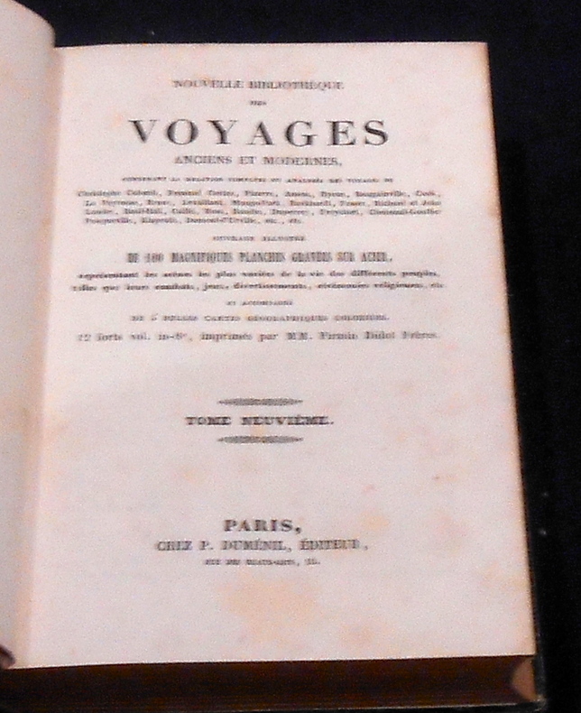Paris, Nouvelle Bibliothèque des Voyages, chez P. Duménil, tome neuvième, sans date (circa 1844). Reliure demi basane, 14,5 cm x 22 cm, 438 pages, 8 gravures hors-texte. Rousseurs sinon bon état
