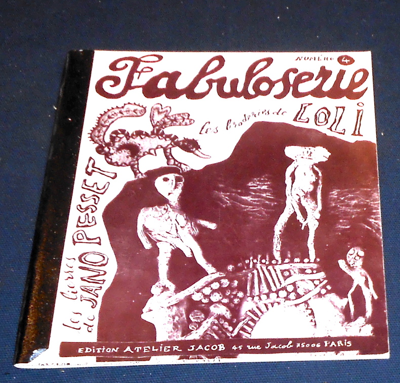 Paris, Éditions Atelier Jacob, Fabuloserie n°4 , 1981. Agrafé, 20 cm x 24 cm, 23 pages, illustrations sépia. Texte de Jano Pesset, photographies de Alain Bourdonnais. On joint l’invitation au vernissage de l’exposition et une autre pour l’exposition de Michel Blais, très bon état