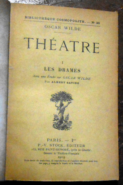 Paris, Éditions Stock, Bibliothèque Cosmopolite, 1909, édition originale. Relié, cartonné, couverture conservée, 12,5 cm x 18,5 cm, 249 pages. Textes de Oscar Wilde, présentation de Albert Savine, envoi du traducteur. Très bon état