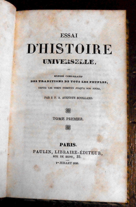 aris, Paulin Libraire-Editeur, 1836, édition originale. 2 volumes reliés, demi basane, 13 cm x 21 cm, 438 pages, 1 tableau dépliant synoptique des migrations des peuples. Texte de J. F. A. Auguste Boulland. Quelques rousseurs sinon bon état