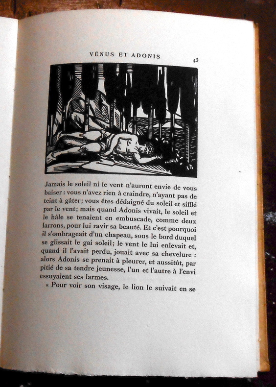 Paris, chez l’imprimeur Léon Pichon, 1921, tiré à 420, 1/370 (n°88) sur vergé anglais à la forme. Broché, couverture à rabats, 18 cm x 25,5 cm, 47 pages, illustrations in-texte. Poème de William Shakespeare, gravures sur bois de Roger Grillon. Très bon état