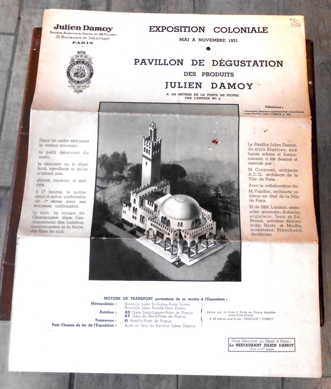 Paris, Société Julien Damoy, 1931. Plié, 28 cm x 37,5 cm, 4 pages .Publicité pour le Pavillon de Dégustation Julien Damoy, en pages centrales plan en couleur de l’exposition et au dos, publicité pour le restaurant Julien Damoy situé Boulevard de Sébastopol. Deux pliures sinon très bon état. La société Julien Damois était une société de commerce d’épicerie à succursales.