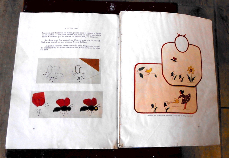 Paris, Compagnie Singer, 1953. Broché, 19 cm x 25 cm, 64 pages, illustrations noir & blanc et couleur in et hors-texte-texte. Texte anonyme, la couture décorative, la reprise, la broderie, couverture illustrée de Bob. Dégrafé, état d’usage