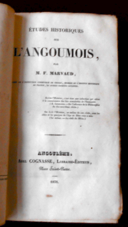 Angoulême, Abel Cognasse Libraire-Editeur, 1835. Reliure demi-basane, pièces de titre dorées, 13 cm x 20,5 cm, 475 pages, 1 plan hors-texte dépliant. Texte de M. F. Marvaud, liste des souscripteurs, reliure de Faucheux, relieur à saintes. Bon état