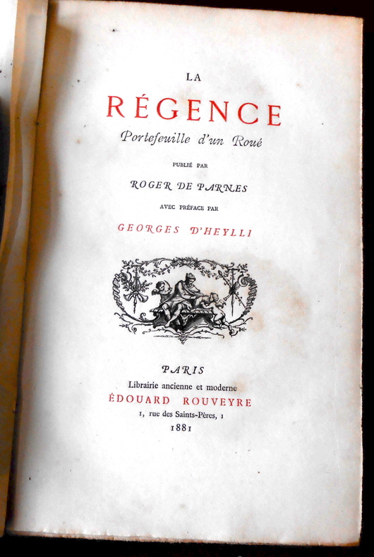 Edition originale "tirée à petit nombre". Frontispice et 3 planches gravés à l'eau forte par E. et L. Rouveyre d'après Marius Perret ; vignettes, lettrines et culs-de-lampe sur bois. Le régent et ses maîtresses, le cardinal Dubois, "Nouvelles à la main", etc. Index.(Vicaire, VI, 1230).Un mors légèrement fendillé.Bel exemplaire, bien relié, très frais, imprimé sur papier vergé de Hollande à la forme, entièrement non rogné.