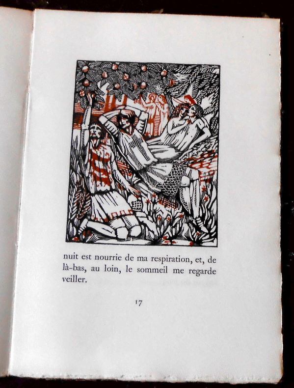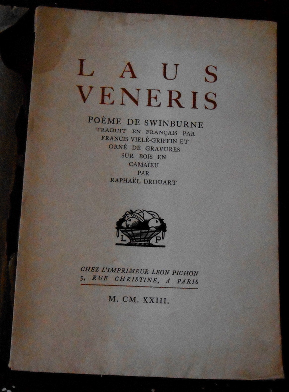 Paris, chez l’imprimeur Léon Pichon, 1923, édition originale numérotée tirée à 443 exemplaires, 1/360 (n°351) sur vélin à la cuve des Papeteries d’Arches. Broché, couverture rempliée, 16 cm x 23 cm, 47 pages, illustrations hors-texte. Poème de Swinburne, traduction de Francis Vielé-Griffin, gravures sur bois en camaïeu de Raphaël Drouart. 1 tache sur le premier plat sinon très bon état.