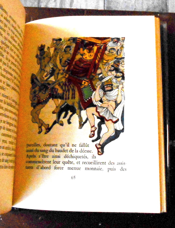 Bruxelles, Éditions Terres Latines, 1946, édition tirée à 987 exemplaires, 1/910 (n°83) dur Madagascar. Relié, couverture et dos conservés, maroquin bleu à bandes, titre et tête dorées, rhodoïd, 18 cm x 22 cm, 92 pages, illustrations couleur in et hors-texte. Conte grec mis en français par Paul-Louis Courier, préface de Marcel Aymé, aquarelles originales de R. de Pauw, reliure non signée de I. Brachot. Très bon état