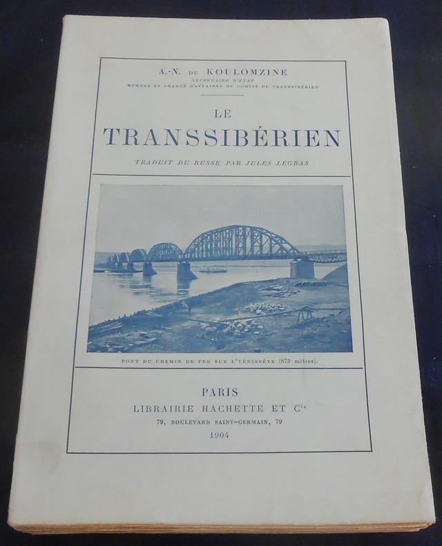 Ouvrage orné du portrait en frontispice de Sa Majesté Impériale Nicolas ALEXANDROVITCH (Empereur et Autocrate de toutes les Russies, Auguste Président du Comité du chemin de fer Transsibérien), de 32 reproductions, de 6 diagrammes et de 3 planches dépliantes en couleurs dont 2 grandes cartes. Paris, Librairie Hachette et Cie, 1904. Petit in-4 (25,5x3x17cm) broché, couverture rempliée, avec une vignette en couleur sur le plat supérieur, fentes au dos. VIII,326pp.