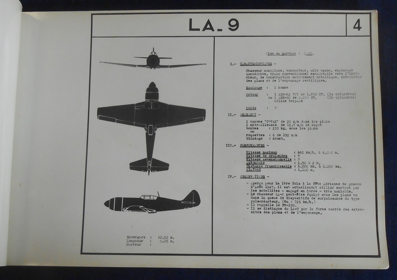 Sans lieu, Etat-Major Genéral des Forces Armées, 2ème Bureau, sans date (circa 1951), tiré à 100 exemplaires numérotés (n°84). Agrafé, 15,5 cm x 23,5 cm Photographies er descriptifs de 9 avions militaires soviétiques (LA-9 et 11, MIG – 15, YAK-17, TU-2, 10, 4, LI-2PS-84 et IL-12), tampon. Léger accroc au dos sinon bon état