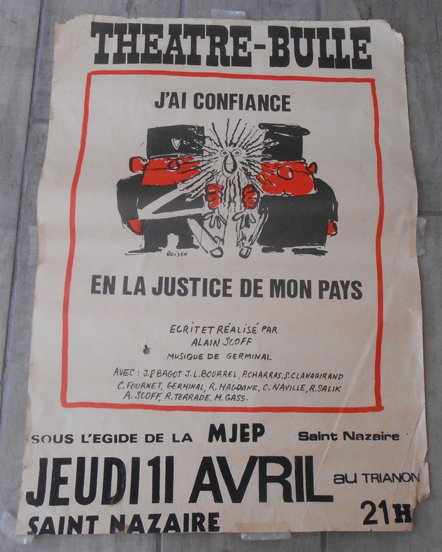 Saint-Nazaire, Théâtre Bulle, au Trianon, jeudi 11 avril sans date (1973). 1 Affiche de Reiser, impression bicolore offset , 45 cm x 63,5 cm, Texte et mise en sçène de Alain Scoff avec Rachel Salik, Jean-Pierre Bagot, Catherine Fournet, Roland Magdane, Sophie Clamagirand, Claude Naville, Pierre Charras, Alain Scoff, Rémy Terrade, Jean-Loup Bourel et Germinal. Traces de scotch et quelques manques dans les angles sinon bon état. La pièce a été écrite d ‘après l’affaire Thénevin, retrouvé mort dans une cellule, la tête encastrée dans un conduit d’aération