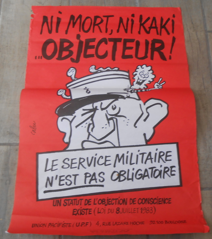 Boulogne , Union Pacifiste (U.P.F.), janvier 1984. 1 Affiche noir, rouge et blanc de Cabu, impression offset, 40 cm x 60 cm. Quelques accrocs sinon très bon état