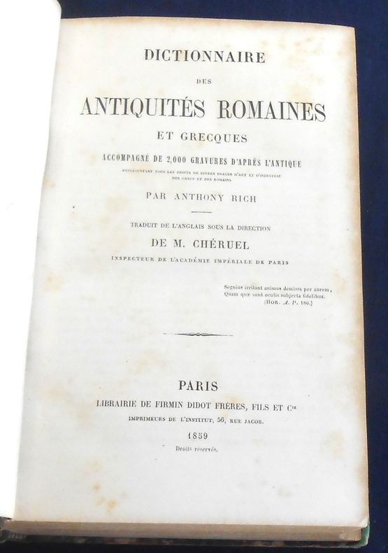 Paris, Librairie Firmin-Didot Frères, 1859. Relié, demi basane, dos à nerfs, pièces de titre dorées, 13 cm x 20 cm, XII+ 740 pages, 2000 gravures in-texte d’après l’antique. Texte de Anthony Rich, traduction de l’anglais sous la direction M. Chéruel. Bon état