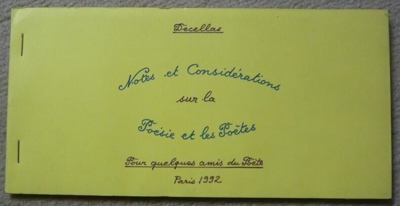 "1992. Paris Pour quelques amis du poète 1992 - Agrafé format à l'italienne 11 cm x 21 5 cm 29 pages - Texte de Jean Decellas bel envoi de l'auteur à Michel Decaudin - Très bon état"