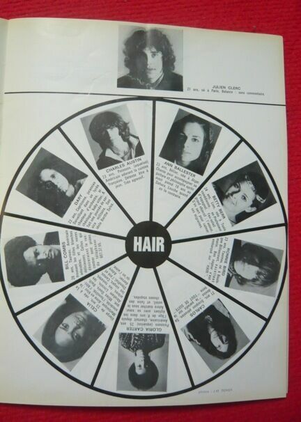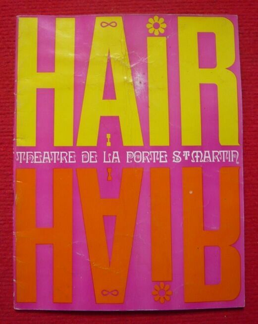 "1970. Paris Programme musical Hair au Théâtre de la Porte Saint-Martin saison 1969-1970 - Agrafé 21 cm x 27 cm non paginé (36 pages) photos N&B in et hors-texte - Texte en français sur les chanteurs et les créateurs du spectacle - Couv et dos défraichis sinon bon état"