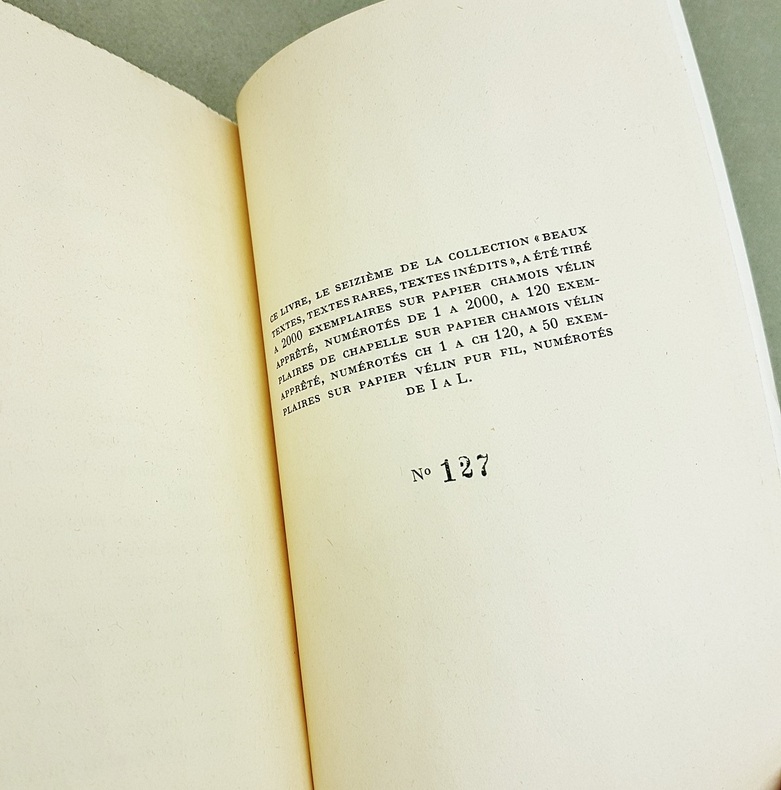 Genève, éditions Cailler 1948, collection Beaux textes, textes rares, textes inédits . Bel exemplaire broché, 1 des 2000 ex. numéroté sur papier chamois vélin, petit in-8, 76 pages avec introduction , notes, illustrations + table.