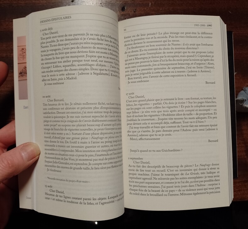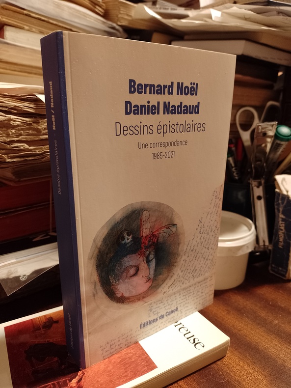 Paris, Editions du Canoë, 2022, 13,2 x 21,1, 470 pages sous couverture rempliée illustrée - dont CXLII pages d'illustrations couleurs. "Cette correspondance fait pénétrer le lecteur au sein d'une amitié qui s'approfondit de lettre en lettre. Elle se fonde sur le travail passionné des deux épistoliers, mêlé à leur vie, qui interroge le monde alentour. Bernard Noël, à travers le langage, Daniel Nadaud, par le biais des images. La plupart des lettres de Daniel Nadaud sont reproduites en couleur pour la beauté de ces missives que Bernard Noël recevait comme un cadeau. Toutes les lettres sont aussi composées en typographie pour que le lecteur puisse les lire sans effort."