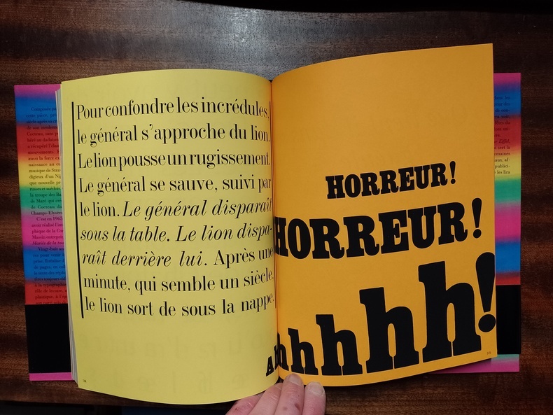 Paris, Hoëbeke, 1994, 22 x 28, 226 pages sous toile éditeur et jaquette décorée. Appropriation graphique & typographique du texte de Jean Cocteau par Massin, - impression sérigraphique sur papiers Pop'set de treize teintes différentes. "Composée par un poète de 30 ans, cette pièce, près de trois quarts de siècle après sa création, n'a rien perdu de son insolente jeunesse. C'est que Cocteau, sans pour autant avoir adhéré au dadaïsme ou au surréalisme, a récupéré l'élan contestataire de ces mouvements. Et le texte exploite aussi la force explosive qui a donné naissance au cubisme comme à la musique de Stravinski, à l'envol prodigieux d'un Nijinski, et à l'esthétique nouvelle prônée par les ballets russes et suédois. Et c'est précisément la troupe des Ballets suédois de Rolf de Maré qui crée, en 1921, la pièce de Cocteau dans un théâtre des Champs-Elysées tout neuf. C'est en 1965, soit deux ans après avoir réalisé l'interprétation typographique de la Cantatrice chauve, que Massin entreprit la mise en pages des Mariés de la tour Eiffel. Vingt-huit ans lui seront nécessaires pour venir à bout de son entreprise. Il réalise d'abord une trentaine de pages, en collant lettre par lettre le texte des répliques dans des caractères toujours différents, faisant jouer à la typographie non seulement son rôle de lecture. Mais surtout un rôle plastique, à l'égal de l'image. D'où son parti pris de faire un sort à chaque réplique, à laquelle, en lui réservant souvent une page entière, il entend donner l'allure d'une affiche. C'est pourquoi aussi, s'agissant d'affiches, Massin fait le choix de couleurs vives et changeantes pour les fonds : on trouve encore, dans les provinces, de ces affichettes pour des ventes qui exploitent ce jeu de couleurs, de même qu'on pourra voir, dans des villages et pour les fêtes du 14 juillet, le papier multicolore utilisé pour la couverture du livre. Avec les Mariés de la tour Eiffel, le lecteur comprendra à quoi sert la typographie dans tous les domaines où elle s'exerce : livres, journaux, affiches, pancartes, annonces publicitaires. Après les Mariés, il ne les lira plus de la même façon."