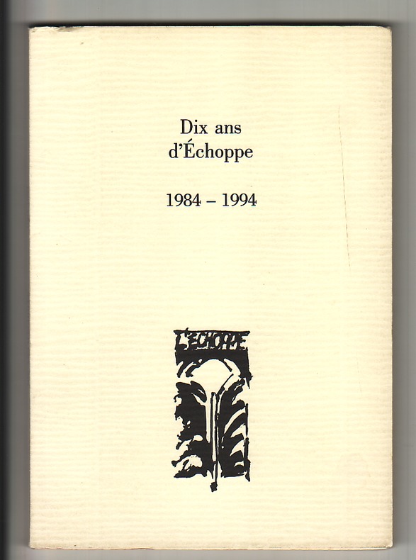 Paris, L'Echoppe, 1994, 15 x 21,5, 109 pages cousues sous couverture rempliée illustrée. Répertorie les livres édités par Patrice Cotensin à l'enseigne de "L'Echoppe" de 1984 à 1994. Nombreuses contributions inédites - textuelles et plastiques - de Dora Vallier, Pierre Alechinsky, Antoine Terasse, Charles Juliet, Gilbert Lascault, Jean-Marc Scanreigh... Tirage à 950 exemplaires sur vergé, les 50 premiers comportant une eau-forte originale d'Olivier Debré.