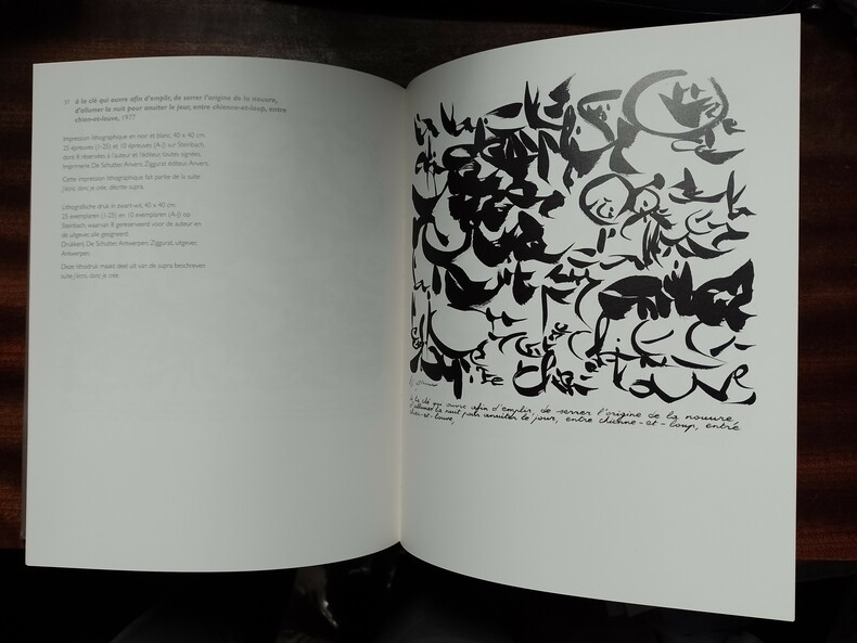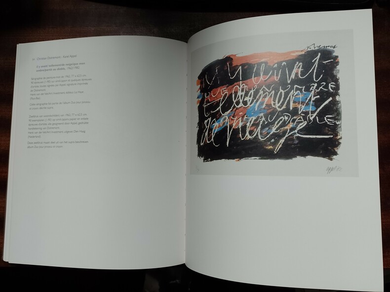 Catalogue de l'exposition "En ecriture dans le texte" a la Samuel Vanhoegaerden Gallery, Knocke. Cette exposition etait une retrospective des logogrammes de Christian Dotremont de 1963 jusqu'a sa mort en 1979. Tous les logogrammes de cette exposition (65 oeuvres) sont reproduits en couleur dans ce livre. Catalogus bij de tentoonstelling "En ecriture dans le texte" in de Samuel Vanhoegaerden Gallery, Knokke. Deze tentoonstelling gaf een overzicht van de logogrammen van Christian Dotremont van 1963 tot aan zijn dood in 1979. Alle logogrammen (65 stuks) worden hier in kleur weergegeven.