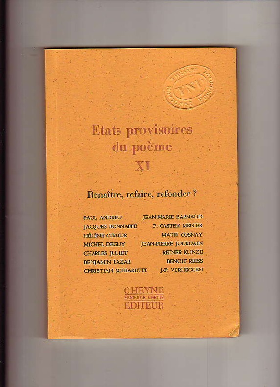 Théâtre National Populaire et Cheyne éditeur, 2011, 14,5 x 22, 176 pages cousues sous couverture rempliée imprimée. Avec les contributions de Hélène Cixous, Michel Deguy, Charles Juliet, Reiner Kunze, Jean-Pierre Verheggen