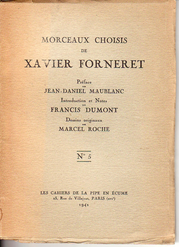 Paris, Les Cahiers de la pipe en écume n°5, 1941, 14 x 19,5, 115 pages cousues sous couverture imprimée. Préface de Jean-Daniel Maublanc. Introduction et notes de Francis Dumont. Dessins originaux de Marcel Roche.