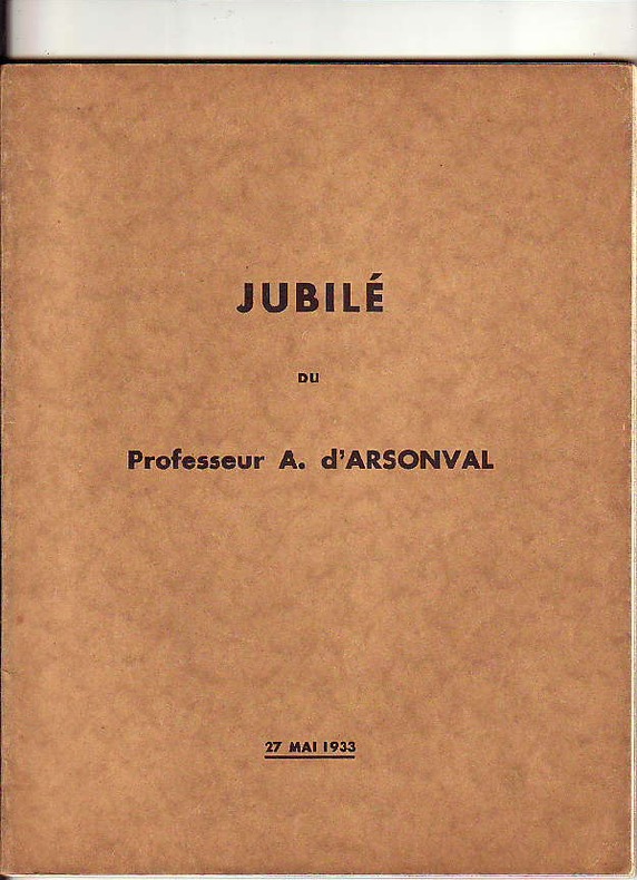 sans lieu, sans éditeur, 1933. Broché. 98 pages. Avec photos et documents en noir et blanc. 21x27 cm. Couverture et dos avec taches, intérieur bon état Le Jubilée du professeur d'Arsonval a été célébré dans le grand amphithéâtre de la Sorbonne, sur l'initiative de la Renaissance Française, en présence de M. Albert Lebrun, président de la République, et sous la présidence de M. de Monzie, ministre de l'Éducation Nationale. Jacques Arsène d'Arsonval, né le 8 juin 1851 à La Porcherie (Haute-Vienne) et mort le 31 décembre 1940 dans la même commune, est un médecin, physicien et inventeur français. On lui doit notamment le galvanomètre balistique, le premier téléphone agréé par les PTT et des études sur l'électrothérapie par les courants à haute fréquence.