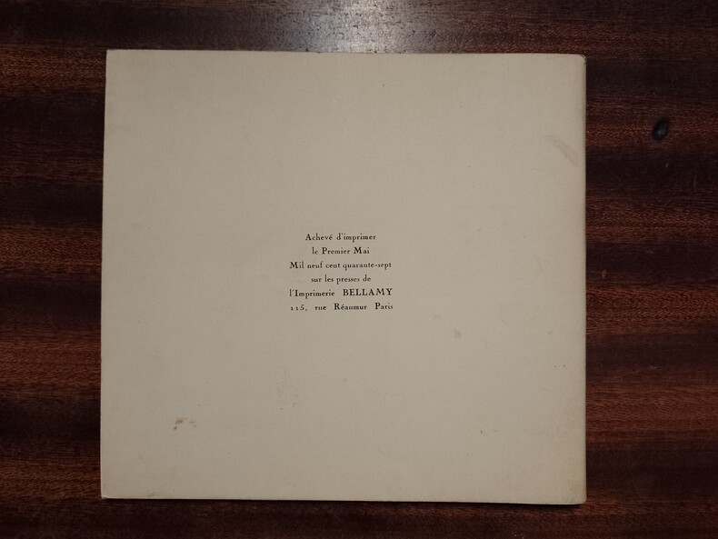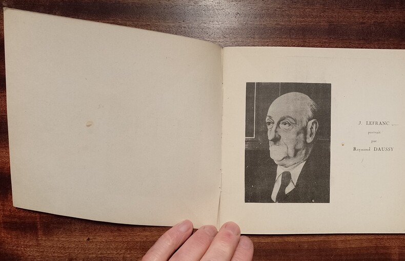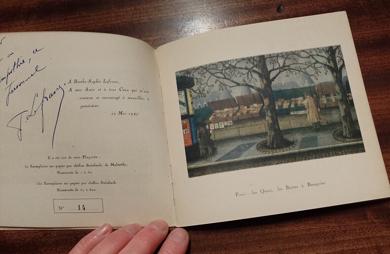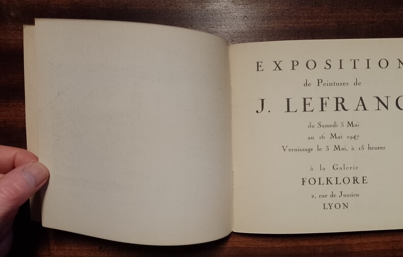 Lyon, Galerie Folklore, 1947, 18 x 17, 24 pages agrafées sous couverture souple imprimée. En frontispice, portrait de Lefranc par Raymond Daussy. Plaquette illustrée de neuf reproductions noir & blanc (dont une en troisième de couverture) et une en couleurs, publiée à l'occasion de l'exposition de peintures présentée du 3 au 16 mai 1947 à Lyon à la galerie Folklore. un des 50 exemplaires (n° 14) sur papier pur chiffon Steinbach de Malmédy, orné d'une dédicace autographe de Jules Lefranc.