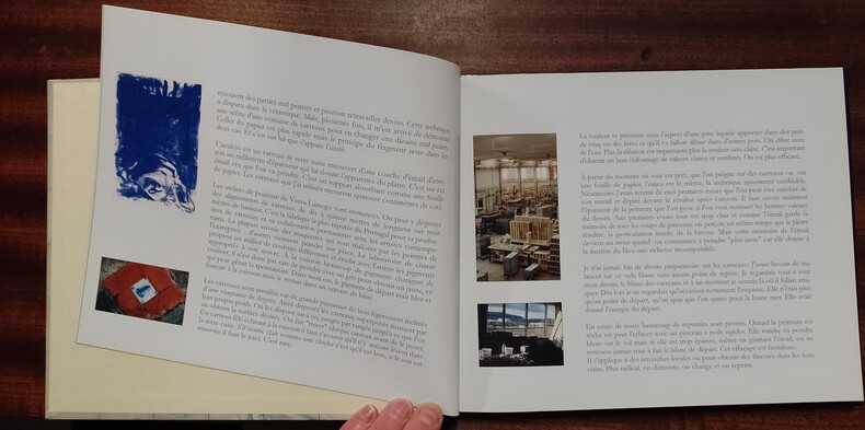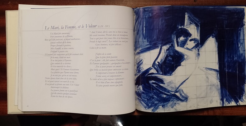 Roanne, Thoba's Editions, "Art en mouvement", 2005, 27,5 x 23, 158 pages sous cartonnage éditeur illustré. Iconographie couleurs. Commentaire de Jean-Marie Auzias. "Cette aventure est née à Lisbonne en décembre 1999. C'est au monastère Saint-Vincent que j'ai découvert des azulejos sur les fables de La Fontaine, datant du dix-huitième siècle, peints en bleu, seulement en bleu, selon la tradition de ce siècle." Patrice Giorda est touché par ce bleu et par la vitrification du trait de … "Cette aventure est née à Lisbonne en décembre 1999. C'est au monastère Saint-Vincent que j'ai découvert des azulejos sur les fables de La Fontaine, datant du dix-huitième siècle, peints en bleu, seulement en bleu, selon la tradition de ce siècle." Patrice Giorda est touché par ce bleu et par la vitrification du trait de l'artiste. Il dessine sa propre vision de l'œuvre de La Fontaine en ne retenant que les fables où ça fait mal," non par masochisme, mais par souci de vérité. Celles-là, et seulement celles-là, projetaient leur lumière sur ces zones d'ombre, connues mais refoulées de ma personnalité ". Nous découvrons ici le travail préparatoire, dessiné au pinceau et au bleu outremer, et les carreaux de terre cuite - azulejos - montés sur des panneaux de bois. Jean-Marie Auzias, philosophe et anthropologue, pose un œil acéré sur le travail de l'artiste. Il nous dévoile en parallèle une relecture des fables de La Fontaine et son interprétation des mises en scène de Patrice Giorda. Deux regards, deux éblouissements sur une œuvre inépuisable."
