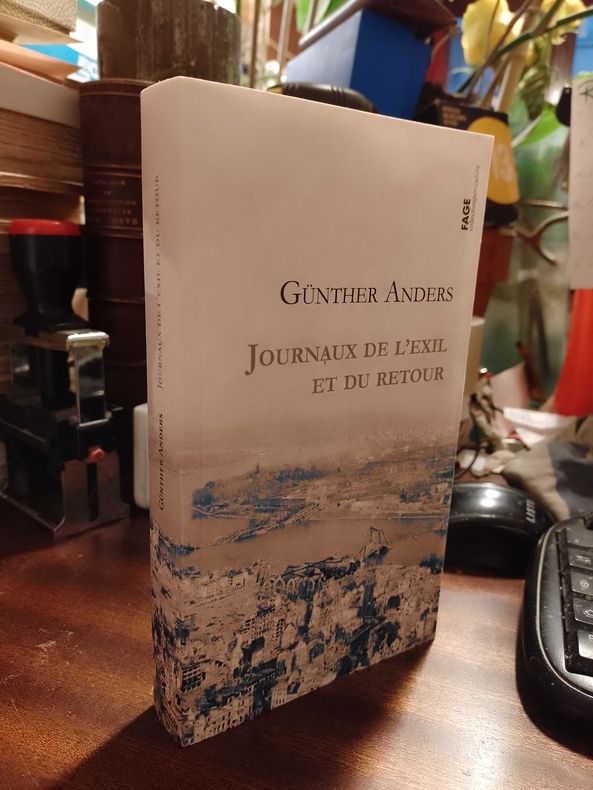 Lyon, Fage éditions, collection "particulière", 2012, 11,5 x 20, 312 pages sous couverture souple illustrée. Traduit de l'allemand par Isabelle Kalinowski. "Les pages des journaux de Günther Anders qui composent ce volume ont été écrites lors de son exil aux États-Unis et, surtout, à son retour en Europe après-guerre. Les premières sont nourries des réflexions et sentiments qu’inspiraient au philosophe émigré contraint à de « petits boulots » pour survivre certaines expériences qui, bien que personnelles, débordaient à ses yeux le cadre privé : un travail d’accessoiriste à Los Angeles, une hospitalisation. Dans les notes plus abondantes, plus graves et plus spéculatives rédigées pour la plupart en Allemagne et en Autriche – un « chez-soi » alors au lendemain d’une catastrophe toute proche -, le philosophe, envahi de sentiments ambivalents (Berlin, 19 juin […] ce qui me désoriente et m’effraie aujourd’hui, […] ce n’est pas ce qui est dévasté, mais ce qui est resté en place. Car ce qui est resté nie le temps. Il ne nie pas seulement ceci ou cela mais le fait même que quelque chose se soit passé entre-temps.), tente de penser encore et encore les notions, mêlées, de ruine, de mémoire et de culpabilité, esquissant en tâtonnant la tâche morale d’aujourd’hui : « rendre possible un vrai monde. »"