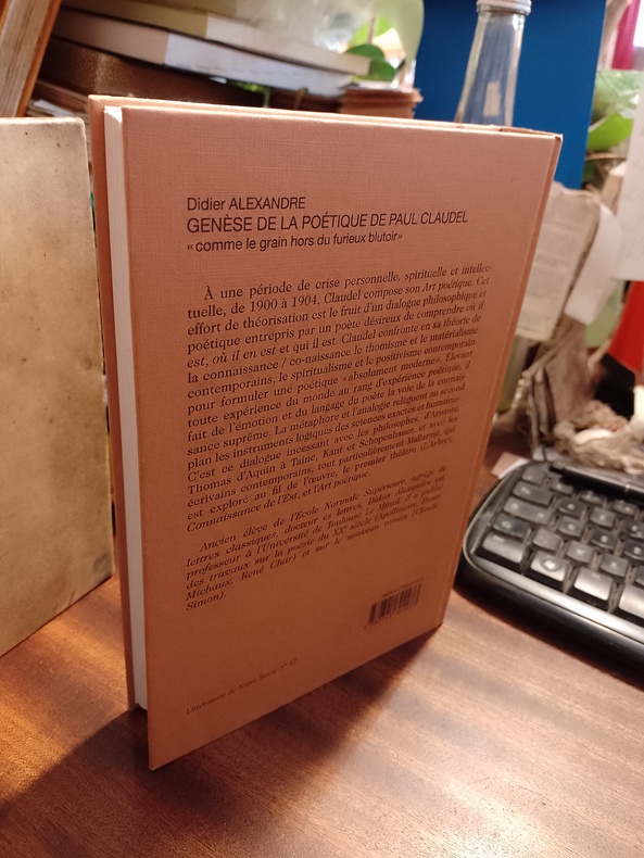 Paris, Honoré Champion, "Littérature de notre siècle" n° 17, 2001, 16,5 x 24, 603 pages sous cartonnage éditeur imprimé. "À une période de crise personnelle, spirituelle et intellec-tuelle, de 1900 à 1904, Claudel compose son Art poétique. Cet effort de théorisation est le fruit d'un dialogue philosophique et poétique entrepris par un poète désireux de comprendre où il est, où il en est et qui il est. Claudel confronte en sa théorie de la connaissance / co-naissance le thomisme et le matérialisme contemporains, le spiritualisme et le positivisme contemporain pour formuler une poétique "absolument moderne". Élevant toute expérience du monde au rang d'expérience poétique, il fait de l'émotion et du langage du poète la voie de la connais-sance suprême. La méta-phore et l'analogie relèguent au second plan les instruments logiques des sciences exactes et humaines. C'est ce dialogue inces-sant avec les philosophes, d'Aristote, Thomas d'Aquin à Taine, Kant et Schopenhauer, et avec les écrivains contemporains, tout particulièrement Mallarmé, qui est exploré au fil de l'œuvre, le premier théâtre (L'Arbre), Connaissance de l'Est, et l'Art poétique."