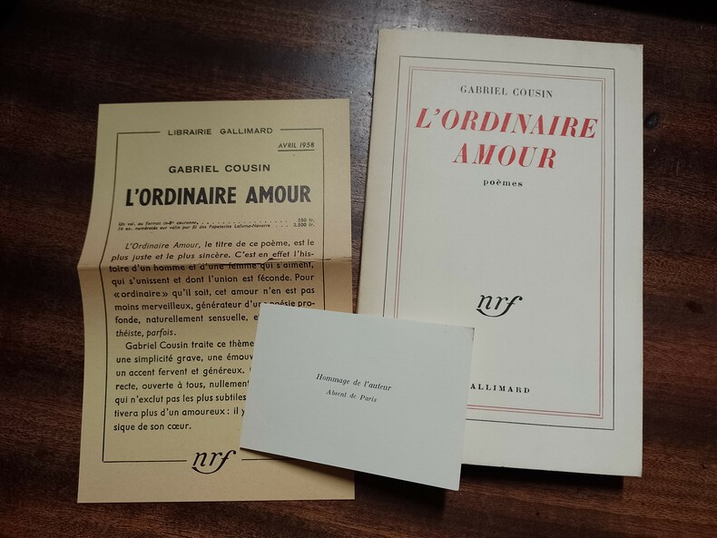 Paris, Gallimard, Collection "Blanche", 1958, 11,6 x 18,3, 180 pages cousues sous couverture souple imprimée. Exemplaire du S.P. (dos poinçonné) de l'édition originale sur papier courant (25 vélin pur fil Lafuma-Navarre) accompagné de l'encart publicitaire de l'éditeur ainsi que la carte jointe en l'absence de dédicace.