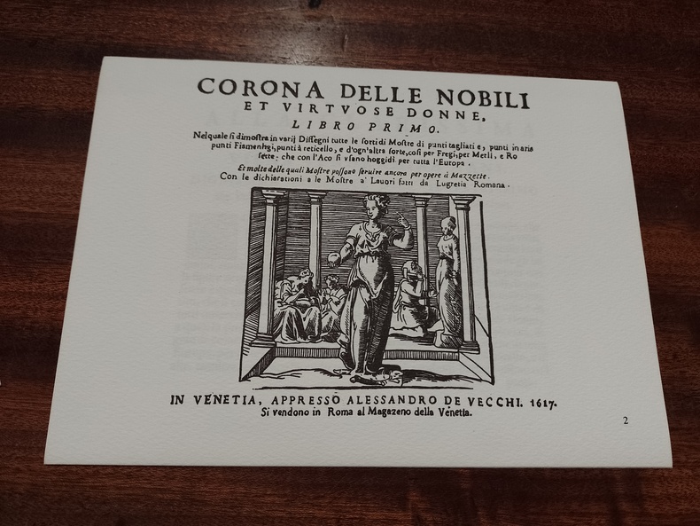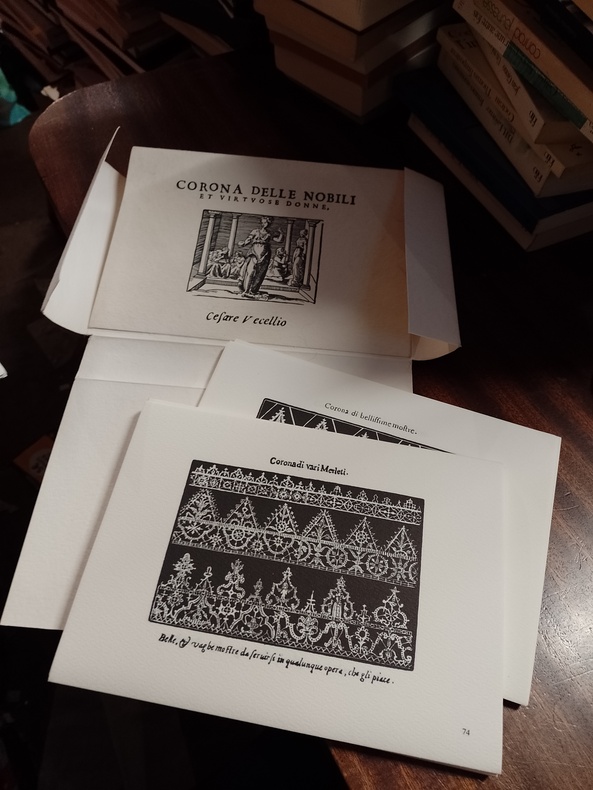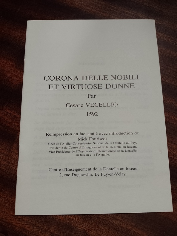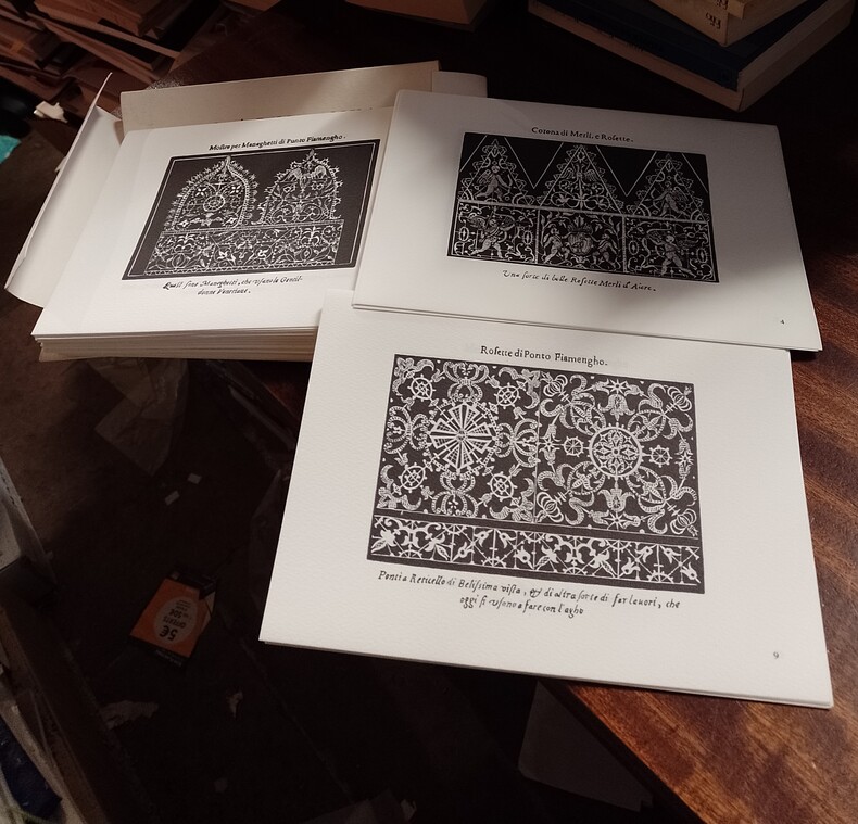 Le Puy-en-Velay, Centre d'Enseignement de la Dentelle au fuseau, 1985, 22 x 16, IV-120 planches - au format 21,7 x 15,7 - sous chemise illustrée. Le tout accompagné d'un livret de 22 pages. Réimpression en fac-similé de l'édition de 1592, avec introduction de Mick Fouriscot. Quelques planches doublées (15, 30, 45, 60, 90, 105 & 120).