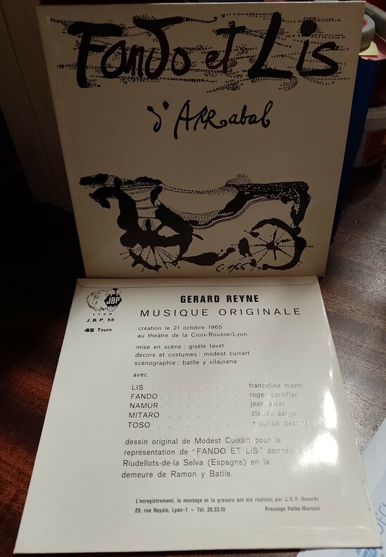 Lyon, JBP Records, 1965, vinyl 45 tours - sous pochette illustrée d'un dessin original de Modest Cuixart - de la musique originale de Gérard Reyne composée pour la pièce d'Arrabal, créée le 21 octobre 1965 au théâtre de la Croix-Rousse à Lyon.