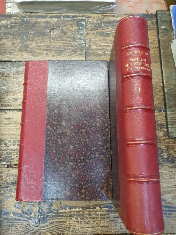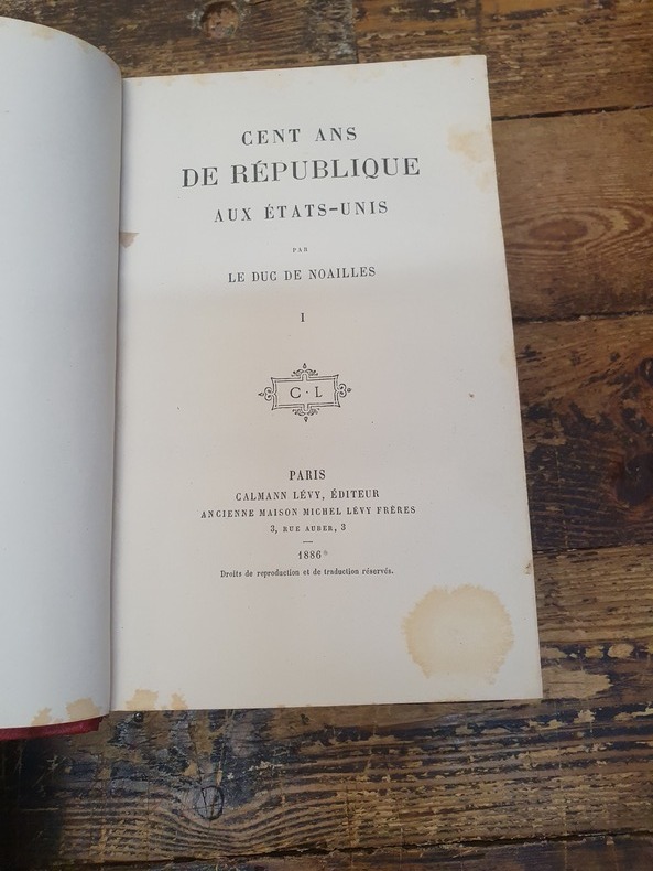 Paris, Calmann-Lévy, 1886 et 1889. Seule et unique édition publiée pour le centenaire de la naissance des États-Unis. Deux volumes in-8 de 220 x 140 mm, (li) 422 + 476 pp. Reliés demi-chagrin lie-de-vin, nom d'auteur, titre et tomaison en doré, filets pointillés aux faux-nerfs, doubles caissons aux entrenerfs avec motif étoilé doré. Pages de garde marbrées. Issu de la librairie de Baptiste-Louis Garnier à Rio de Janeiro, alors l'un des principaux librairies français au Brésil. "Les Anglo-Américains, élargissant à l'extrême le cadre de la démocratie, ont su les premiers fonder et faire vivre un vaste État républicain, où nulle cité, quelle qu'en soit l'importance, n'exerce de domination exclusive, où tous les citoyens, sans distinction, le campagnard et l'habitant de la dernière bourgade, comme celui de New-York, la ville impériale, possèdent la plénitude des droits politiques avec une égalité parfaite." (p. vii)
