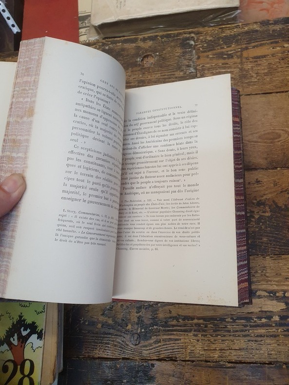 Plats frottés, chasses frottées et quelque peu attaquées sur le tome 2, charnières en bon état, quelques rousseurs au marge sans perte au texte. Tampon d'ancien propriétaire en page de titre et tampon type bibliothèque de l'autre côté de ladite page. Menus trous de ver aux premières pages du tome 2. Dos élégants, reliures solides, texte complet. Un titre intéressant à lire après la Démocratie en Amérique de Tocqueville, qui aura certainement inspiré l'auteur.