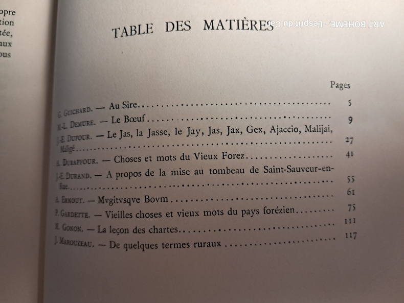 Contributions de : - G. Guichard.- Au Sire. - M. L. Demure.- Le Boeuf. - J. E. Dufour.- Le jas, la jasse, le jay, jas... - A. Duraffour.- Choses et mots du Forez. - J. E. Durand.- A propos de la mise au tombeau de Saint-Sauveur-en-Rue. - P. Gardette.- Vieilles choses et vieux mots du pays forézien. - M. Gonon.- La leçonn des Chartes. - J. Marouzeau.- De quelques termes ruraux. ...................... Photos sur demande ..........................