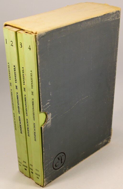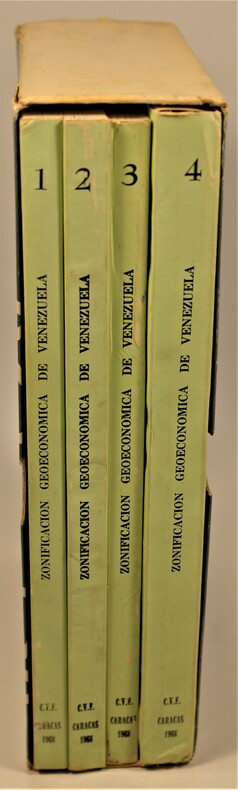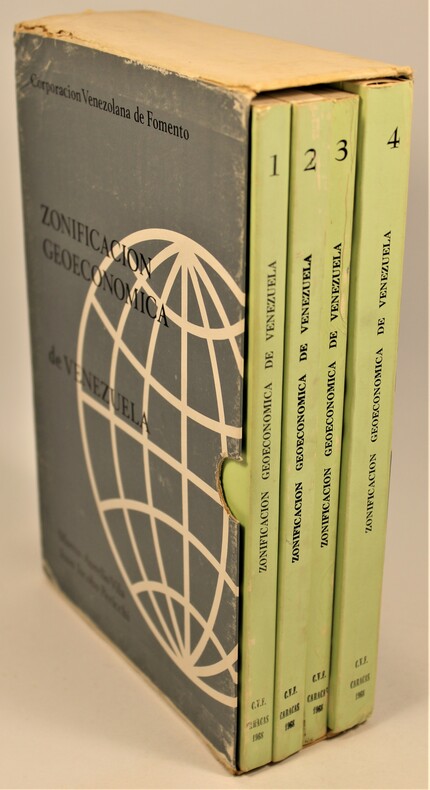Corporacion Venezolana de Fomento 1968 4 volumes dans emboitage : Tome 1 - Generalidades - 243 pages / Tome 2 - Zonas geoeconomicas - 260 pages / Tome 3 : zonas geoeconomicas - 243 pages / Tome 4 : Atlas - 16 cartes et 5 tableaux Emboitage traces de choc et frotté - Tome 1 : 4e de couverture corné / Tome 2 : bon état / Tome 3 : bon état / Tome 4 : bon état 1674 g