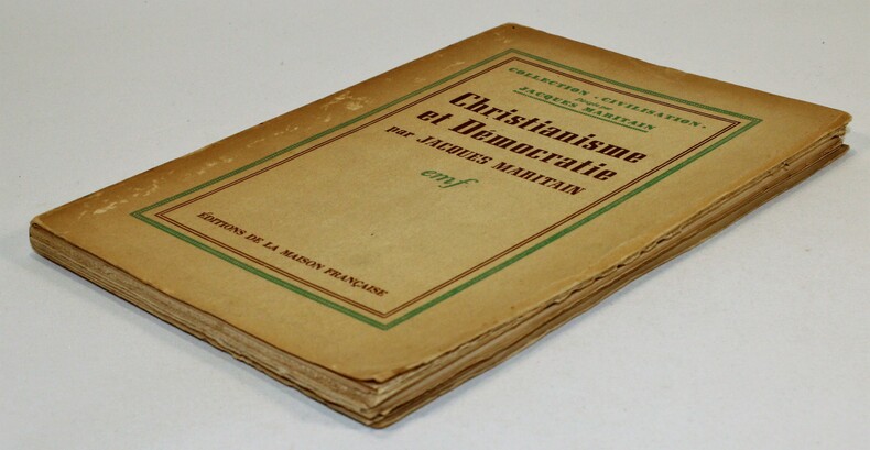 1ere édition en France de 1945, le texte est paru pour la première fois en 1943 aux Etats-Unis Contents, Chapitres : Préface - La fin d'un âge - La tragédie des démocraties - Trois remarques - L'inspiration évangélique et la conscience profane - La vraie essence de la démocratie - Les nouvelles élites - Le problème communiste - Un humanisme héroïque - Jacques Maritain, né le 18 novembre 1882 à Paris et mort le 28 avril 1973 à Toulouse, est un philosophe français. C'est l'une des figures importantes du thomisme au XXe siècle. Agnostique élevé dans le protestantisme, Jacques Maritain se convertit à la foi catholique en 1906 et cette religion a profondément imprégné sa philosophie. Après une phase anti-moderniste, où il était proche de l'Action française, il s'en détacha et finit par accepter la démocratie et la laïcité (Humanisme intégral, 1936). Son uvre fut liée de près à l'éclosion de la démocratie chrétienne, malgré les réserves de Maritain lui-même à propos de son organisation concrète. - Son influence philosophique et religieuse sur certains jeunes intellectuels proches ou ayant été proches de l'Action française comme ses encouragements aux initiatives d'Emmanuel Mounier et à la création de la revue Esprit vont contribuer, au début des années 1930, à favoriser la naissance du personnalisme des non-conformistes des années 30. Lui-même va être amené à approfondir parallèlement la réflexion politique et sociale qui s'exprime dans Humanisme Intégral (1936), en le rapprochant des milieux de la démocratie-chrétienne. Il demeurera cependant très critique à l'égard des partis démocrates-chrétiens, préférant la mise en place d'un mouvement démocrate-chrétien qui transcenderait les seuls partis catholiques. Dans cette uvre majeure, Maritain entérine les acquis de la Révolution française et du libéralisme, refusant le mélange des sphères temporelle et spirituelle, tout en prônant l'engagement des catholiques dans la vie de la cité, et donc de la politique, non pas par la création de partis confessionnels, catholique, mais en étant inspiré par la religion dans l'action (source : Wikipedia) infimes traces de pliures sur les bords des plats sans aucune gravité, sinon bel exemplaire, intérieur frais et propre, papier à peine jauni
