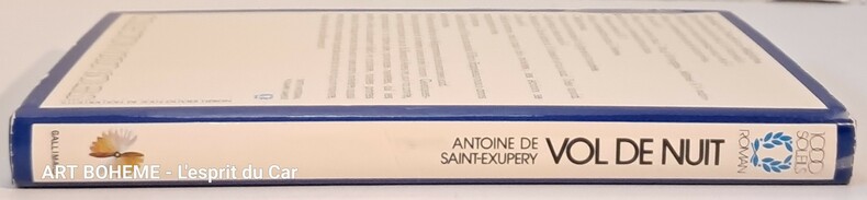 Titre : Vol de nuit Auteur : Saint-Exupéry Antoine Éditeur : Gallimard - NRF Lieu d'édition : Paris Date d'édition : 1953 Édition : 52e édition - achevé d'imprimer le 26 janvier 1953 (dépôt légal : juin 1931) - n° d'édition 3168 - n° d'impression 2220 Préface : André Gide Langue : français Format : in-12 Reliure : demi-cuir à coins, dos lisse en cuir brun titré or, coins et mors en cuir vert, plats recouverts d'un papier cartographique illustré État du livre : bon état général - dos patiné et frottements d'usage aux coiffes et aux coins - tranches et papier uniformément brunis avec rousseurs éparses - intérieur propre, solide, sans annotations Description : Exemplaire de la NRF, avec la mention ‘52e édition' sur la page de titre. Impression réalisée sur les presses de L'Imprimerie Moderne, 177 avenue Pierre-Brossolette, Montrouge (Seine). Marque nrf au titre. Roman majeur de l'auteur, ici précédé de la préface d'André Gide. Joli exemplaire en reliure demi-cuir décorative, non d'éditeur.