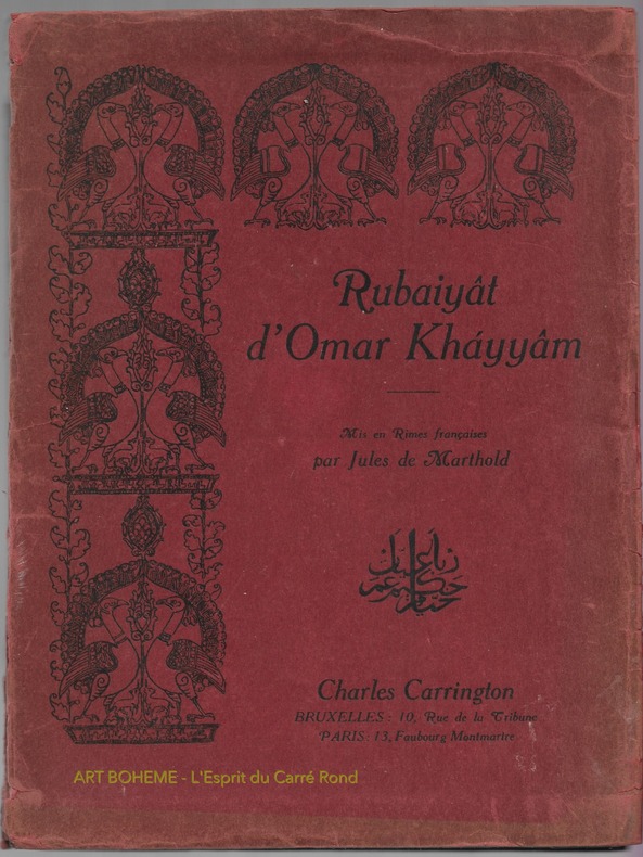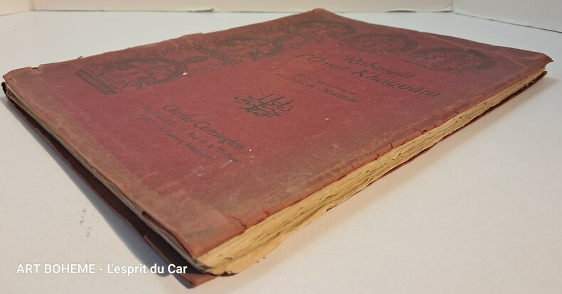 Traduit en anglais par Edward Fitzgerald.Charmant calendrier illustré de poèmes persans (Rubaiyat signifie quatrain) imprimés en caractères gothiques sur un papier glacé, et encadrés de motifs orientaux enluminés aux couleurs vives.1ère garde en partie déchirée sans manque. Coins légèrement frottés.