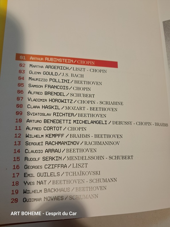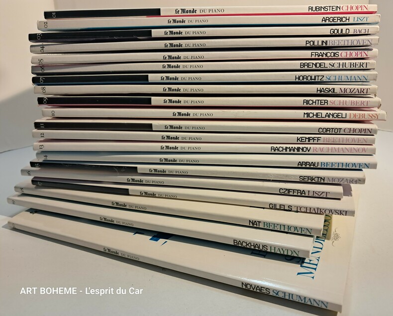 2009-2010 20 livrestsw contenant 2CD chacun - 1/ Arthur Rubinstein/Chopin - 2/ Marta Argerich/Chopin/Schumann/Liszt - 3/ Glenn Gould/Bach - 4/ Maurizio Pollini/Beethoven/Schumann-Schubert - 5/ Samson François/Chopin - 6/ Alfred Brendel/Schubert - 7/ Vladimir Horowitz/Moussorgski/Mendelssohn/Chopin/Scriabine - 8/ Clara Haskil/Mozart/Bach/Beethoven/Schumann - 9/ Sviatoslav Richter/Schubert/Rachmaninov/Schumann - 10/ Arturo Benedetti Michelangeli/Debussy/Brahms/Chopin - 11/ Alfred Cortot/Chopin/Franck Mendelssohn - 12/ Wilhelm Kempff/Beethoven/Liszt/Brahms - 13/ Sergeï Rachmaninov/Rachmaninov/Mendelssohn/Grieg/Schumann - 14/ Claudio Arrau/Beethoven/Weber/Debussy/Balakirev - 15/ Rudolf Serkin/Mozart/Brahms/Mendelssohn - 16/ Georges Cziffra/Liszt - 17/ Emil Gilels/Tchaïkovski/Saint-Saens/Prokofiev/Chostakovotch - 18/ Yves Nat/Beethoven/Brahms/Schumann - 19/Wilhelm Backhaus/Haydn/Beethoven - 20/ Guiomar Novales/Beethoven/Chopin/Schmann/Mendelssohn Très bon état 3 000 g