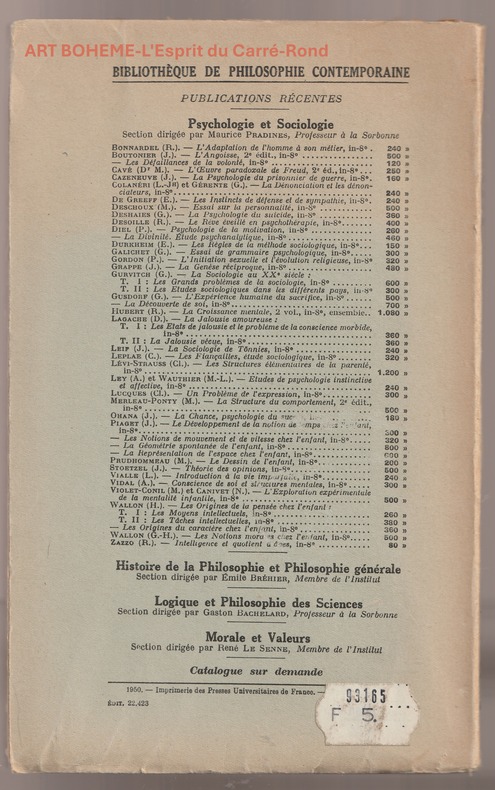 Paris, Presses Universitaires de France, 1950 ; in-8 (145 x 228 mm), XX-152 pp., broché. Bibliothèque de Philosophie contemporaine, fondée par Félix Alcan. Préface du docteur Pierre Janet.