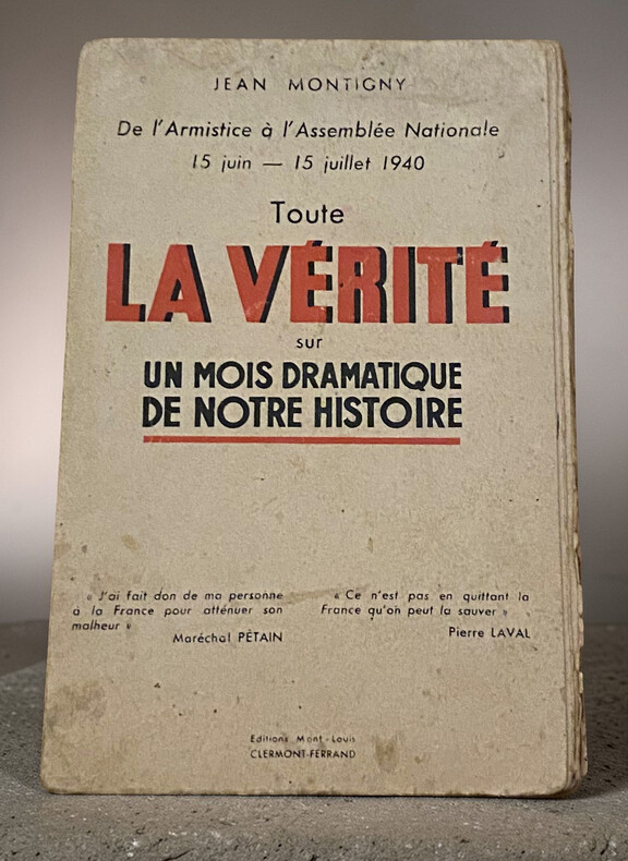 Député de la Sarthe, Montigny (1892-1970) rallia Pierre Laval en 1940, vota les pleins pouvoirs au maréchal Pétain, et devint directeur de la censure du régime de Vichy. Il relate ici le déroulement de ce mois dramatique. Le 17 juin à 12h30, Pétain, alors âgé de quatre-vint-quatre ans, prononce son allocation dans laquelle il annonce: “C’est le coeur serré que je vous dis aujourd’hui qu’il faut cesser le combat… Que tous les Français se groupent autour du gouvernement que je préside pendant ces dures épreuves et fassent taire leur angoisse pour n’obéir qu’à leur foi dans le destin de la patrie.” — "Proche collaborateur de Joseph Caillaux, ce radical-socialiste fut élu député de la Sarthe en 1924 et constamment réélu jusqu'à la guerre. Passé aux radicaux indépendants au début des années 1930, il se rapprocha dès lors de la droite. Il soutint d'emblée le maréchal Pétain auquel il vote les pleins pouvoirs et flirte avec la presse collaborationniste – il livrera à l'occasion quelques articles à La Gerbe. Membre du Conseil national, il est déclaré inéligible à la Libération et s'engage alors dans la plupart des combats néo-pétainistes..." (Jérôme Cotillon, Ce qu'il reste de Vichy, 2003)