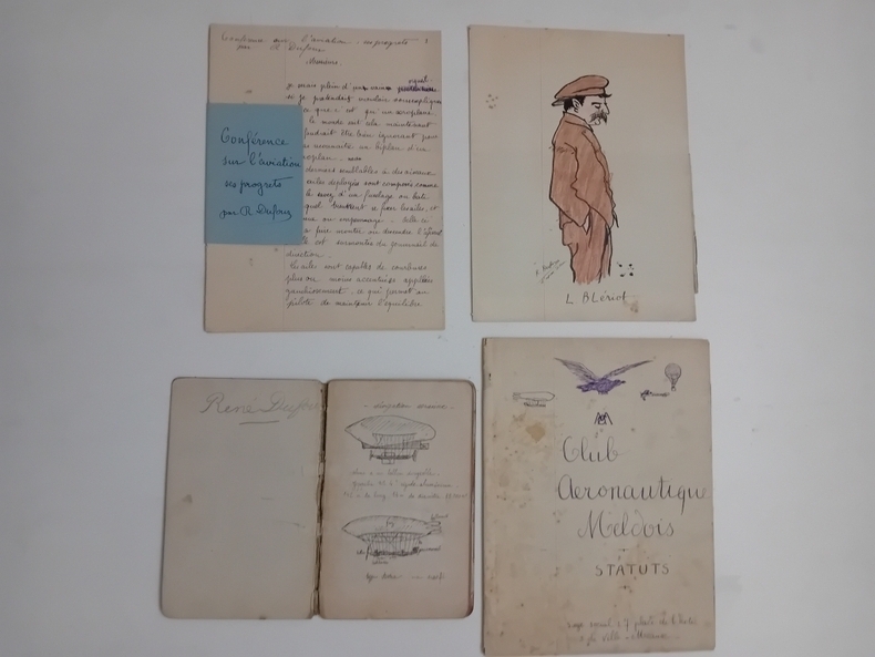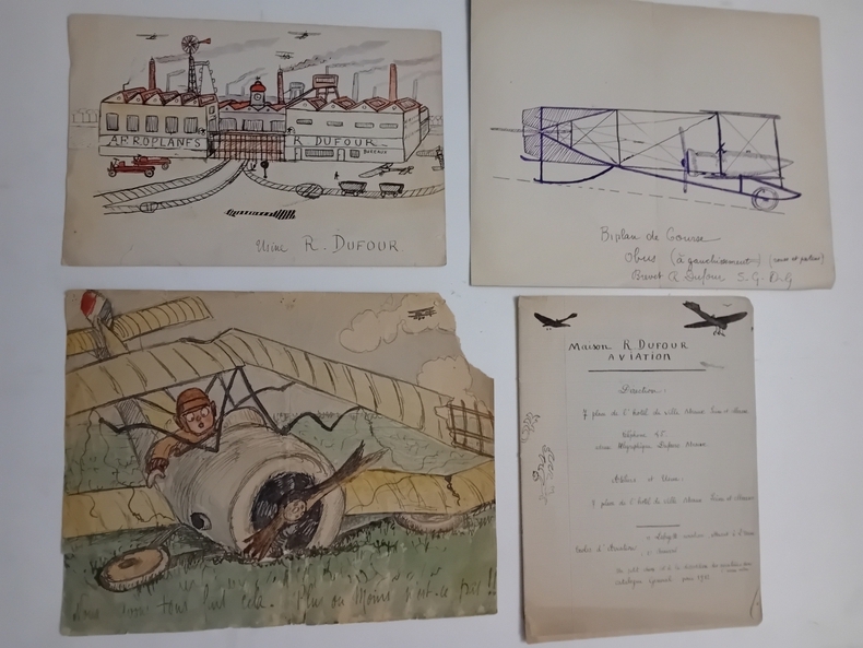 Dossier de dessins, manuscrits vers 1912. Statuts du Club Aéronautique Meldois, 7 Place de l'Hôtel de Ville, Meaux. Maison R. DUFOUR AVIATION Siège Social à MEAUX, Catalogue 1912.