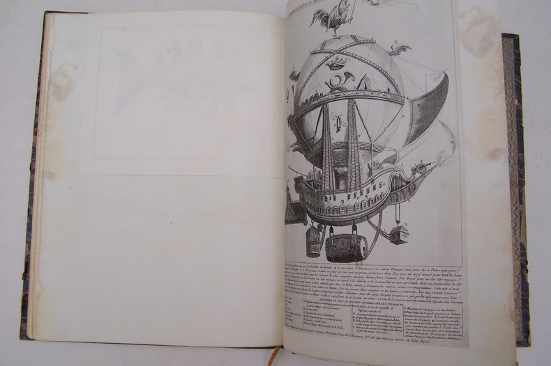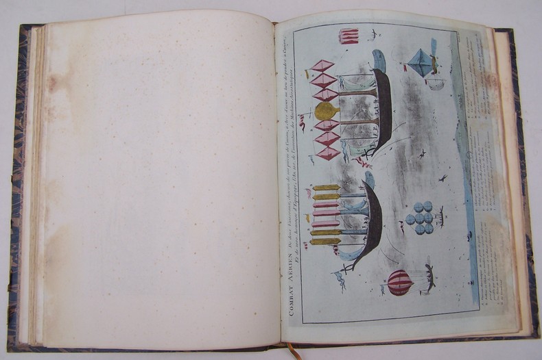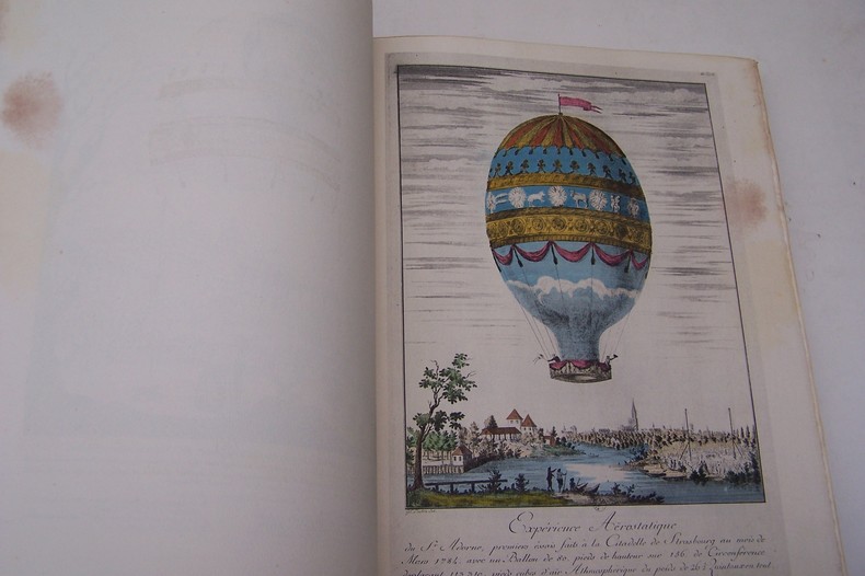 Sous étui bordé. Reliure plein maroquin fauve. Premier plat orné en son centre d'une composition en mosaïque de maroquin et filets noirs représentant la première ascension réalisée en aérostat par Pilâtre de Rozier et le marquis d'Arlandes en 1783. Dos à nerfs. Toutes tranches dorées. Filets doubles sur chasses et coiffes. Doublure de maroquin havane à encadrement de maroquin fauve et de filets (noirs et dorés). Gardes de moire carmin. Couvertures conservées. 206 reproductions et fac-similés hors textes contrecollés. Reliure signée de Noulhac et datée 1921.