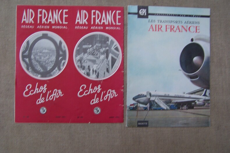 AIR FRANCE: intinéraires long-courriers long-distance flights. Billet de passage et bulltin de bagages ALGER-PARIS 1961, LE BOURGET-CLERMON-FERRAND 1956. COMPAGNIE NATIONALE AIRFRANCE: Obligation Décembre 1975. Securité des vols, Régulation de l'exploitation N° 2 Juillt 1972. Ls transports aériens AIR FRANCEpar Henry LAILE, Hachette, 1963.cEChos de l'Air N° 49 Août 1951. Croisières aériennes. Paris-Washington, Paris San Juan. AIR FRANCE Tourisme sourisres du monde Hiver 1964-65. Scandinavie et Finlande. Itinéraires Longs-Coutriers Hémisphère Nord.