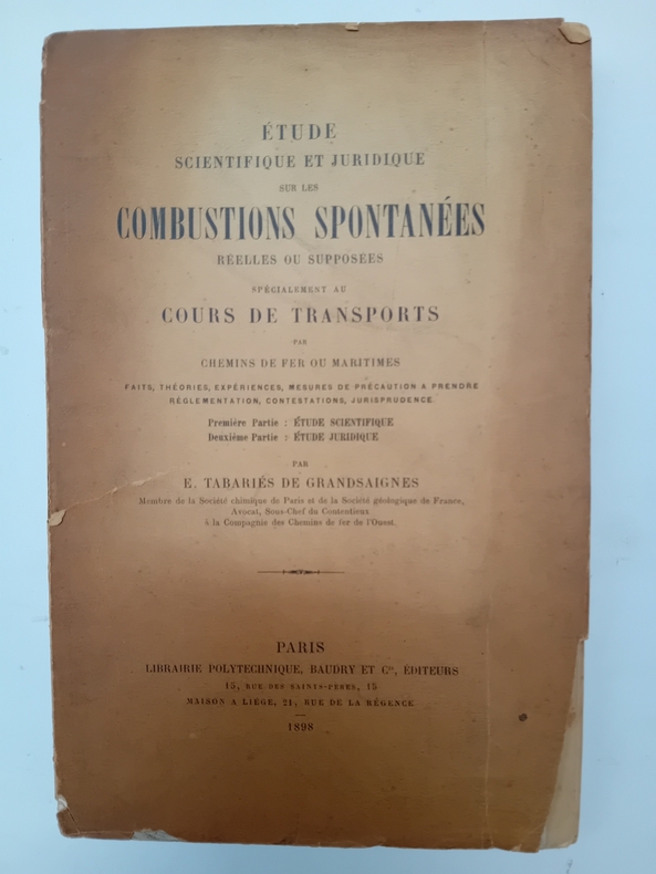 Sommaire : acide nitrique ou azotique - acide sulfurique - acier en poudre - arbres - bois - bois vermoulu en sciure en copeaux - caoutchoux volcanisé - chanvre - chaux vive - briquettes - chiffons gras - concentration de rayons - corps humain - corps gras - feuilles mortes - fourrages - fumier - gaz divers - poils du blé - plantes cuites - pyrites - résine - soie soie teinte - son grillé - soude du commerce - ouate - lin - juridictions criminelle correctionnelle civile commerciale role des experts - matières sujettes à la combustion spontanée - réglementation anglaise allemande internationale nouvelle réglementation française etc - 1ER PARTIE : ETUDE SCIENTIQUE - 2E PARTIE : ETUDE JURIDIQUE. Classification Dewey : 500-SCIENCES DE LA NATURE ET MATHEMATIQUES